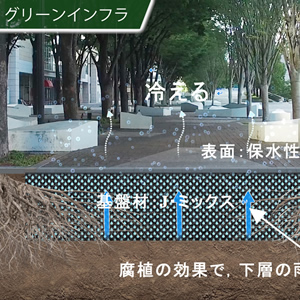 その常識を覆したのが腐植です。これを礫の表面にコーティングすることで、根は礫のすき間を伸長して生育します。腐植のもつ緩衝能力です。単粒度の礫で形成された空隙内には水、空気、栄養が存在し、一般土壌より条件が良いのです。雨水はその空隙に一時的に溜められることから、豪雨対策のための貯留浸透槽としても意味をもちます。雨水は根によって吸い上げられ、葉から蒸散する際に周囲からエネルギーを奪い空気を冷やします。同時に、地下の雨水は地表の保水性ブロックに供給され、「打ち水効果」で冷えるのです。結果、公園を訪れた人が涼しさを実感でき、人の賑わいを誘致できる効果にもつながっています。
