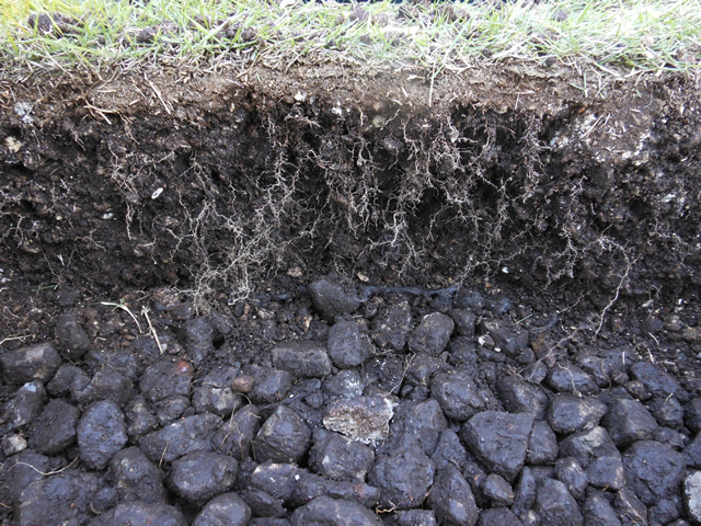 (1)雨水を貯留浸透できるだけでなく、(2)表層を歩道や外構として利用できる耐圧性能を保持し、(3)植物や樹木の根を誘引して生育を支え、同時に蒸発散作用を通して大気を冷却することが可能な 日本版グリーンインフラ技術(J・ミックス工法)です。